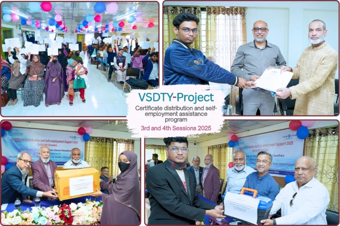 জমজম চ্যারিটেবল ট্রাস্ট ইউকে-এর অর্থায়নে এবং জমজম বাংলাদেশ কর্তৃক বাস্তবায়িত Vocational Skill Development Training for Youths 2024–2025 প্রকল্পের ৩য় ও ৪র্থ সেশনের প্রশিক্ষণার্থীদের সার্টিফিকেট বিতরণ ও আত্মকর্মসংস্থানে সহায়তা প্রদান অনুষ্ঠান সম্প্রতি সিলেট নগরীর কুমারপাড়াস্থ জমজম টাওয়ারে অনুষ্ঠিত হয়েছে।